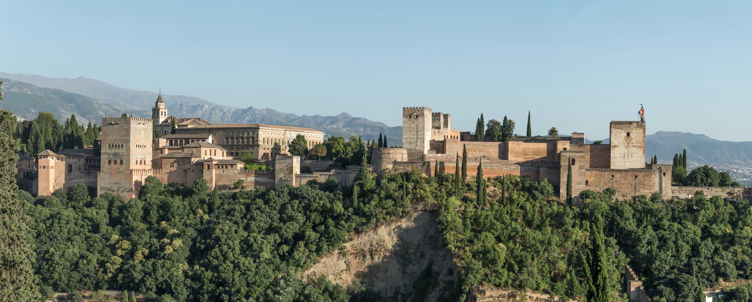 Die Alhambra ist eines der berühmtesten Monumente Spaniens und ein Meisterwerk der maurischen Architektur. Sie liegt auf einem Hügel über der Stadt Granada und war ursprünglich eine Festung, die im 13. und 14. Jahrhundert von der Nasriden-Dynastie in einen königlichen Palastkomplex umgewandelt wurde. Die Alhambra, was auf Arabisch „die Rote“ bedeutet, hat ihren Namen von der rötlichen Färbung ihrer Mauern.